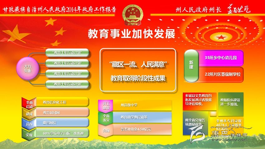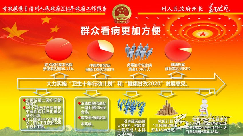 加大民生投入,全年民生支出139億元。全州城鎮(zhèn)新增就業(yè)7400人,城鄉(xiāng)低保實現(xiàn)應保盡保;在全省民族地區(qū)率先實施醫(yī)療保險制度城鄉(xiāng)統(tǒng)籌,異地就醫(yī)即時結(jié)算全面啟動;在全省率先出臺大病醫(yī)療保險規(guī)定。教育事業(yè)加快發(fā)展。新建35所鄉(xiāng)中心幼兒園、22所片區(qū)寄宿制學校,州高級中學開工建設。全面落實教育助學惠民政策,兌現(xiàn)各類補助金4.58億元。城鄉(xiāng)居民基本醫(yī)保參保率達到99.13%,健康檔案建檔率達到92%;開工建設120個標準化鄉(xiāng)(鎮(zhèn))衛(wèi)生院和225個村衛(wèi)生室;衛(wèi)生信息化建設一期工程和遠程會診、教學系統(tǒng)建設基本完成;兌現(xiàn)計劃生育“三項惠民制度”資金1809萬元。群眾文化生活日益豐富。建成縣“兩館”12個;開工建設州民族體育館、州農(nóng)牧民演藝培訓中心和14個縣級全民健身中心,建成農(nóng)民體育健身工程739個;開展 “送文化下鄉(xiāng)”近千場;康巴文化研究院“四大工程”全面啟動。深入實施“百千萬康巴英才工程”,人才科技工作扎實有效。扶貧移民工作成效明顯。完成1360個貧困村、19.91萬扶貧對象立卡建檔工作;實施整村推進63個、連片開發(fā)項目4個、彝家新寨(村)17個、索改橋23座,易地扶貧搬遷9850人,2.65萬群眾生產(chǎn)生活條件得到改善。