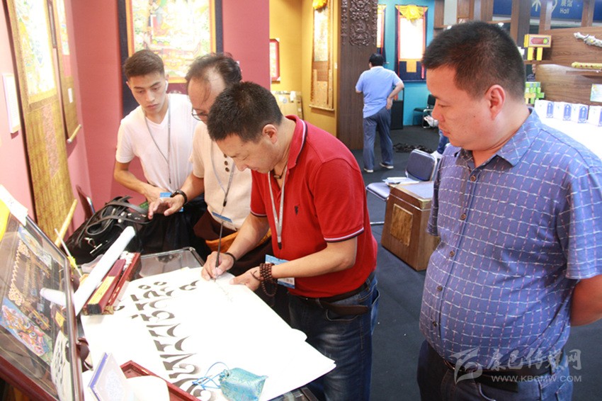 本屆文博會(huì ),巴松鄧珠帶來(lái)了一件藏文書(shū)法作品《格薩爾王》,讓現場(chǎng)觀(guān)眾嘖嘖稱(chēng)贊。孫先生說(shuō):“把書(shū)法作品用藏族唐卡藝術(shù)的裝裱方式來(lái)裝裱,真讓我開(kāi)了眼界。這件作品圖文并茂,真是太棒了,讓我覺(jué)得甘孜這個(gè)地方特別神圣,令人向往。我以后有機會(huì )不僅要好好練習藏文書(shū)法,還要去甘孜旅游?!?/p>