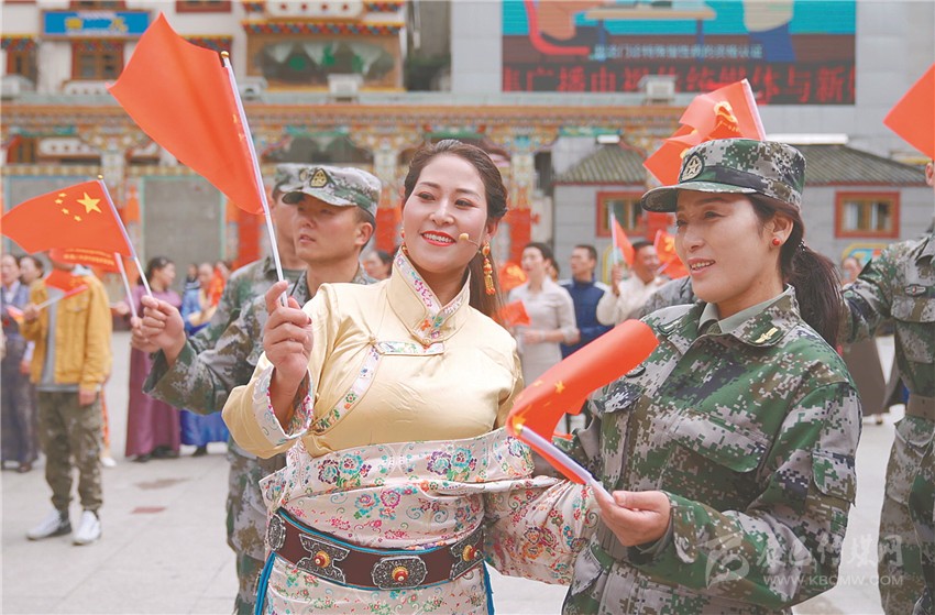美妙的歌聲縈繞四方,鮮艷的旗幟迎風(fēng)飄揚(yáng)。就在眾人忘情高歌之時(shí),來(lái)自州歌舞團(tuán)的50多名演員將一面巨大的印有“建州70年Logo”的紅旗,在廣場(chǎng)正中鋪展開(kāi)來(lái)。以這面旗幟為中心,先后到來(lái)的人們組成了三個(gè)同心圓,用歌聲禮贊甘孜州建州70周年。
