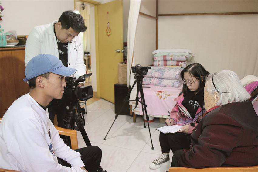圖為記者在磨西鎮采訪(fǎng)百歲老人。