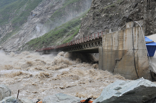 6月29日,恰逢周末,但在該公司的防汛指揮中心已是繁忙緊張氣氛,防汛值班員雖已熬紅了雙眼,緊盯著監(jiān)視屏并時刻保持與前方的聯(lián)系;7時23分,該公司副總經(jīng)理杜三林,長河壩工程部、安全環(huán)保部相關(guān)負責人來到了指揮中心;8時,流量逼近4170立方米每秒;10時,流量超過4200立方米每秒,已超過該工程自2010年開工以來最大流量,整個指揮中心的氣氛變得隨之凝重起來;10時30分至11時,指揮中心接連收到施工單位電話險情報告:此時此刻,長河壩工程初期導(dǎo)流洞水勢兇猛,導(dǎo)流洞出口橋0號橋臺回填料淘刷嚴重,1號橋墩發(fā)生傾斜,橋梁隨時有傾覆的可能,將會危及下游圍堰高程最低的中水十四局、中水五局營地的安全,更將會危及到300余名員工的人身安全;金湯河突發(fā)特大洪水,沖垮了通往金湯土料場的場內(nèi)公路,沿線山體已發(fā)生了小型泥石流,土料場通訊、交通已全部中斷,急需救援;持續(xù)降雨引發(fā)響水溝泥石流,3萬余立方米泥石流堆積物順溝而下,沖垮了響水溝石料場的鋼橋,并堵塞了場內(nèi)12號路1號隧道。必須馬上清運疏通,否則,響水溝再發(fā)泥石流,長河壩上游圍堰和大壩填筑工作面將直接面臨泥石流堆積物的直接沖擊,險情萬分緊急!