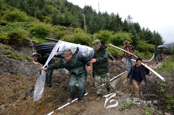 “非常感謝武警官兵!如果不是你們幫忙,我們的‘引水到村’計劃將一再推遲,影響村民的用水……”老榆林村村長項康玉感激地對官兵說。老榆林村原來的自來水飲用水源現已不夠用了,村民吃水面臨時斷時有的問題,為保證村民飲用水供應,由政府出資一部分,村民集資一部分,村里決定利用山頂常年的冰雪融水作為水源。前期,老榆林村已請工程隊挖好山頂至村子的2000余米的管線溝,由于連日陰雨,加之山高路險,鋪設管線工程的事一拖再拖,以致挖好的管線溝多處被雨水沖下的泥石填埋,嚴重影響飲水工程的竣工時間。村民們心里都很著急,但村里的年輕人大部分都外出打工,留守的大多是婦幼,抽不出勞力,村長項康玉無奈之下求助武警官兵。武警四川省總隊二支隊領導得知情況后,第一時間派出官兵投入老榆林村自來水管線鋪設工程。