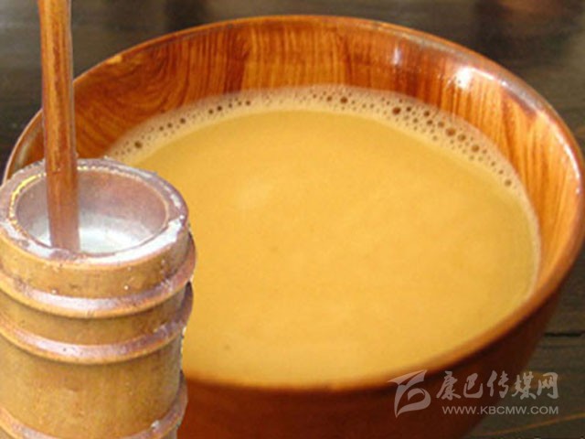 酥油茶是藏族群眾每日必備的飲品。是西藏高原生活的必需。寒冷的時(shí)候可以驅(qū)寒;吃肉的時(shí)候可以去膩;饑餓的時(shí)候可以充饑;困乏的時(shí)候可以解乏;瞌睡的時(shí)候,還可以清醒頭腦。藏民們?nèi)粘V谱魉钟筒钑r(shí)一般使用磚茶,需要時(shí)用刀切削一小塊備用。然后在鍋中加300毫升水煮沸,加3到5克碎磚茶,煮到茶水變黑熄火。茶水變色后,可加入0.5克鹽。如果天氣寒冷的話還可以多加一些鹽。最后,再加入2克酥油(約湯匙的三分之二)。飲用時(shí)將酥油茶經(jīng)過(guò)濾網(wǎng)注入茶壺中再倒進(jìn)小茶杯飲用。