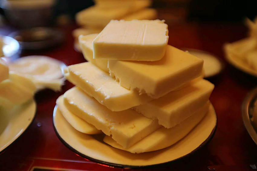 酥油是藏族民眾主要的食用油脂。藏族諺語(yǔ)說(shuō):“沒(méi)有駿馬的草原不美,沒(méi)有酥油的糌粑不香?!辈刈迕癖姶蛩钟筒?、揉糌粑都離不開酥油。據(jù)史料記載,文成公主入藏時(shí),帶去了內(nèi)地的茶葉,公主“使乳變成奶酪,從乳取酥油”,有了茶和酥油,才有了酥油茶。