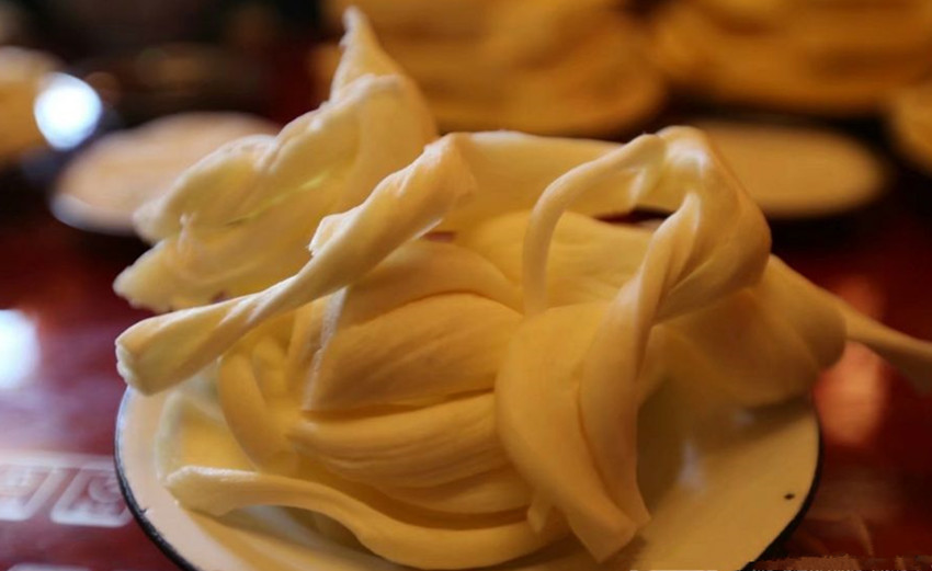 奶餅在木雅地區(qū)的種類較多,一種是用未提煉酥油的奶酪制成,不帶酸味,稱“甜奶餅”,形同小鍋盔,有兩層較厚的酪皮;另一種是“麻花絞”奶餅形同麻花,撕開呈纖維狀,是用提煉過(guò)酥油的奶酪制成;還有一種是各地都普遍制作的“本脫”,呈坨狀;將“本脫”揉搓成顆粒狀,曬干即成奶渣。