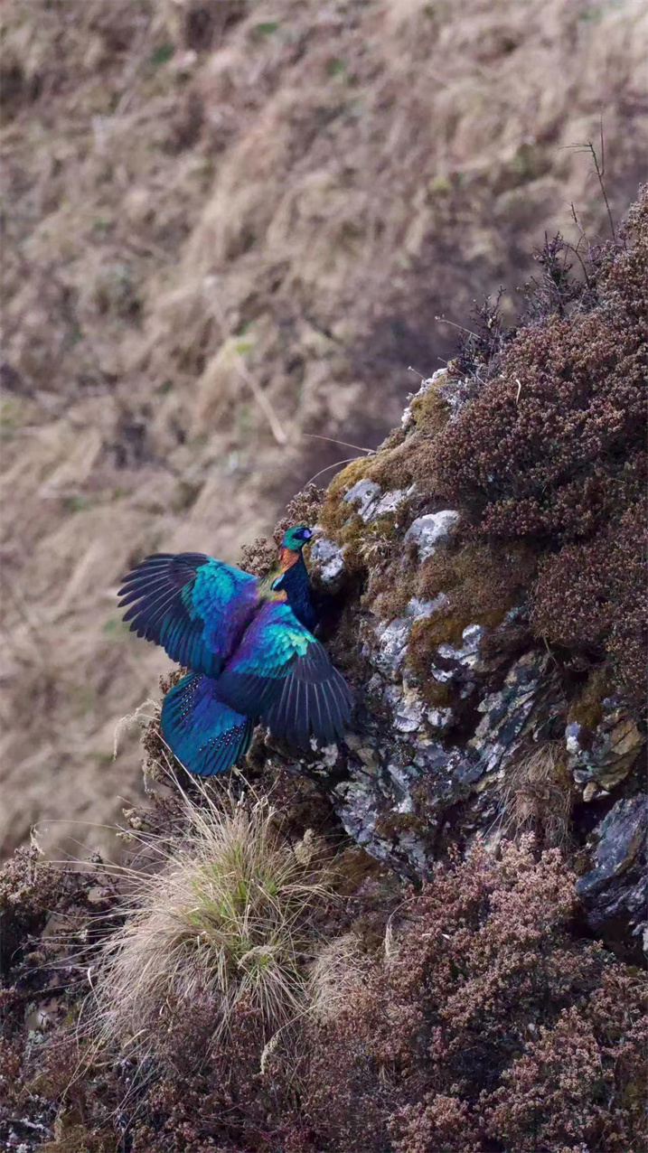 本網(wǎng)訊 日前,筆者跟隨中國綠發(fā)會鳥類生物多樣性保護研究院院長、世界生態(tài)組織鳥類生態(tài)專委會主任艾雅康一行來到海拔4500米的九龍縣洪壩鄉(xiāng)羊圈門村神山牛場,經(jīng)過3晝夜的蹲守,終于拍攝到了國家一級保護動物有著“蜀山彩虹”“鳥中大熊貓”之稱的綠尾虹雉。
