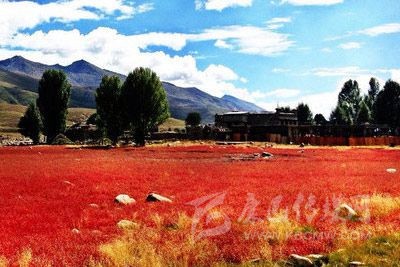 “紅草地”的后面是一個(gè)小村莊,村莊的周圍也有一些白楊樹,在秋風(fēng)的熏陶下大都已變成金燦燦的黃色?!凹t草地”的四周被幾座大山所環(huán)抱。晚秋中,五顏六色的大片色塊亮麗張揚(yáng)地組合在一起,水天同彩地纏綿出一幅斑斕、夸張、濃墨重彩的油畫山水。在黃綠相間的楊樹和藍(lán)天白云的映襯下,紅得特別的燦爛。一片只有足球場(chǎng)大的紅草地,每年只有十多天的風(fēng)光,是成了稻城一個(gè)標(biāo)志性景點(diǎn)。